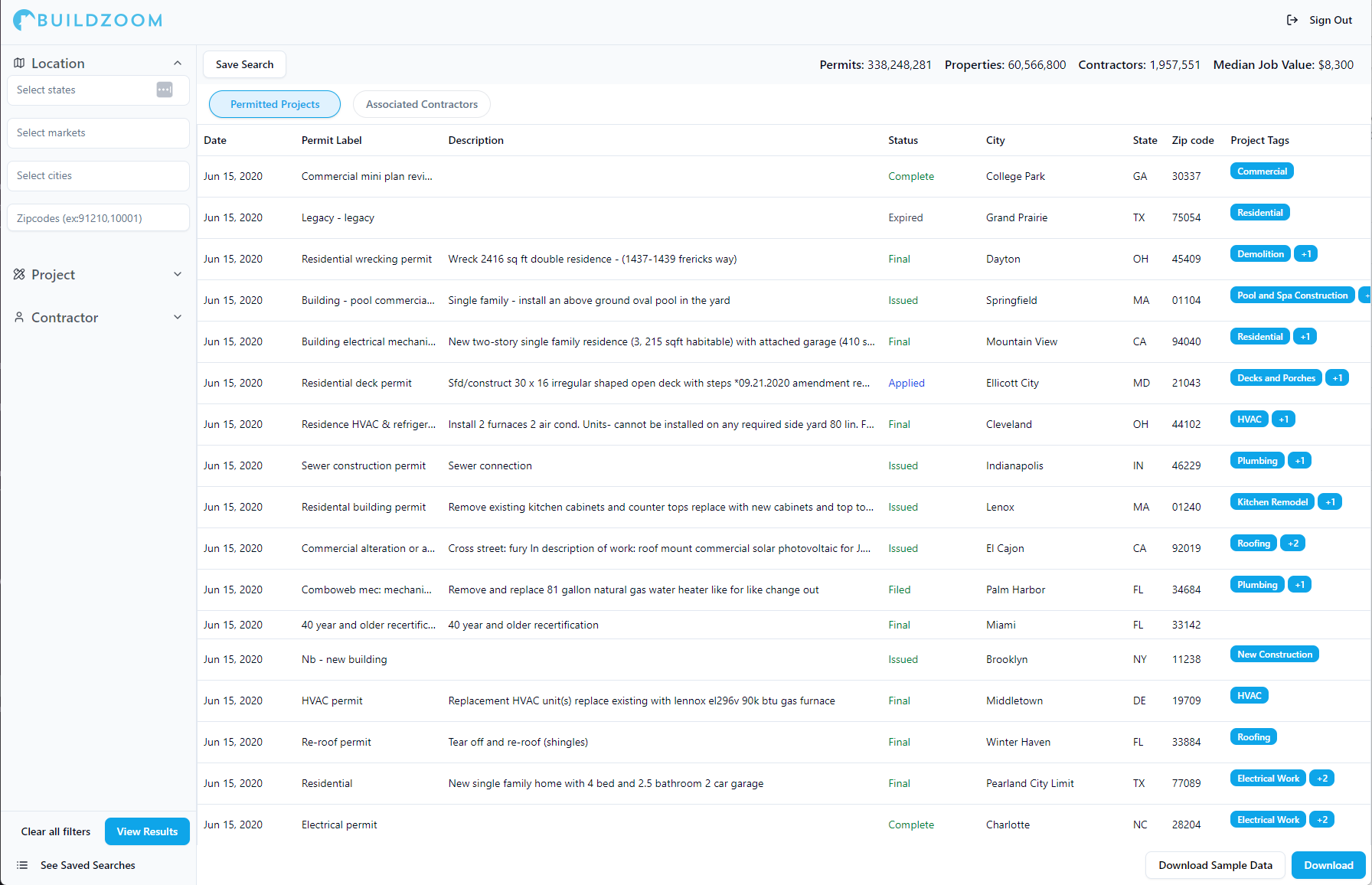 Bulk data files provide access to our entire data set of 6M+ construction companies and 350M+ building permits spanning 25+ years of history and covering 90% of the US population.